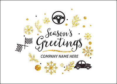 Detailed with a steering wheel, checkered racing flags, and a vintage car, the Auto Icons Christmas Card is certain to get your business moving in the right direction. Perfect for any auto business looking to connect with customers during the holiday season, the Auto Icons Christmas Card features a stylish black and white design with golden snowflakes and tree branches surrounding a season's greeting message. Printed on glossy card stock, this card measures 5" x 7" and can be fully customized with your company name, logo, ink colors, fonts, and a personal message on the inside.