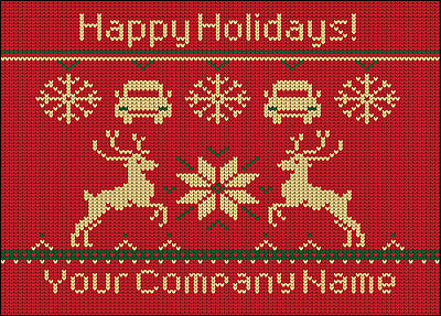 Strengthen client relationships this holiday season with a personalized Auto Reindeer Christmas Card. In a vintage-inspired holiday sweater motif with cars, reindeer, and snowflakes, the Auto Reindeer Christmas Card offers a fully customizable design that can be detailed with your company name, logo, and custom artwork. Printed on glossy card stock, this 5" x 7" card comes with many free upgrades, allowing you to include a personal message, choose from a variety of ink colors and fonts, and enjoy free envelopes printed with your return address. Prefer to see your card in person before placing an order? Request a free sample now!