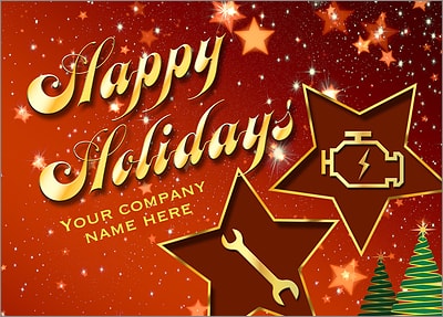 Increase profits in the new year by connecting with current clients and prospective customers with our Mechanic Christmas Sky card. Printed on 5" x 7" glossy card stock, the Mechanic Christmas Sky card is perfect for auto mechanics looking to solidify client relationships, and it features a colorful, festive print with gold stars, green Christmas trees, and a happy holidays message across the front. Add your company name and logo, include a personal message or greeting, and choose your own colors and fonts to create a look that's unique to your business. With a special holiday greeting, you're sure to see more business in the new year!
