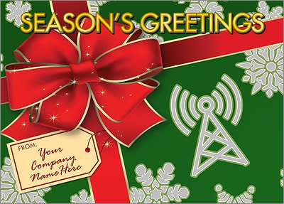 Detailed with a gift tag that we can print with your company name, the Cell Tower Gift Wrap Christmas card is perfect for cell tower companies looking for a unique way to connect with clients during the holiday season. The Cell Tower Gift Wrap Christmas card measures 5" x 7" and features green snowflake wrapping paper with a pretty red bow and a seasons greetings message printed on smooth, glossy card stock. This design can be fully customized with your company name and logo, printed with a unique message, and detailed with your choice of colors and fonts. Upload your company logo to start customizing your cards now!