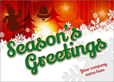 Thank your clients for their business and wish them a prosperous new year with our festive Christmas Snow Card. Detailed with snowflakes, a snowman, trees, bells, and stars, the Christmas Snow Card is the perfect way to say season's greetings to clients during the holiday season. With many free upgrades included, this card measures 5" x 7" and is printed on glossy card stock that gives it a smooth look and feel. It can be completely customized inside and out, and we've even left room on the front to add your company name. Add your own touch to the inside by including a unique message and choosing from a variety of colors and fonts.