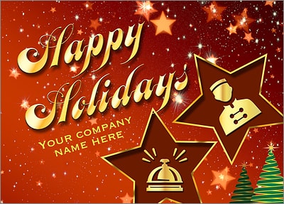 Welcome previous guests and corporate clients to visit your hotel during and after the holiday season with our Hotel Christmas Sky card. Detailed with a bellhop, a front desk bell, and a happy holidays message, the Hotel Christmas Sky card is printed on 5" x 7" glossy card stock and features a gold star print with green Christmas trees that add a festive touch. This card is fully customizable, allowing you to add your company name to the front, add a unique message on the inside, and choose your own colors and fonts. Upload the name and logo of your hotel now to start customizing cards for your business online!
