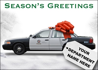 Whether you're in the business of outfitting police forces with the latest gear, or hoping to boost community relations this holiday season, there's no better way to send warm holiday wishes than with our cruiser police Christmas card design. Add a truly personal touch to your cruiser police Christmas card when you take advantage of our many free upgrades including your choice of ink color & font, your logo/shield & custom greeting printed on the design, and envelopes printed with your return address. Don't take our word for it though, order your free samples today to experience our friendly, reliable service and our premium 5x7" cards.