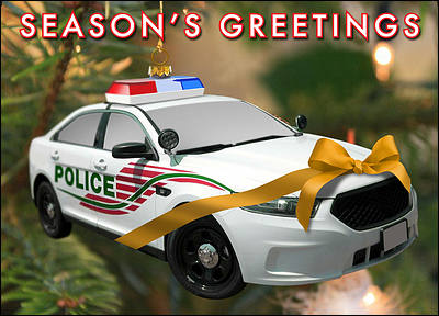 Don't hang around waiting for a great idea, our ornament police Christmas card is the perfect way to bolster relations with clients, the community, and your staff. This festive ornament police Christmas card design features a police cruiser ornament and a season's greetings sentiment. For a truly personal touch, we offer many free options and upgrades including your choice of ink color & font, your logo/shield printed on the design, your custom greeting, and envelopes printed with your return address. Our 5x7" cards are printed on premium card stock and are backed by our friendly, reliable service. Experience the Ziti Cards difference for yourself - order your free samples today!
