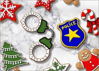 Police officers and law enforcement officials can show appreciation for their neighbors, colleagues, and local businesses with our Police Cookies Christmas Card. The perfect way to connect with members of the community during the holiday season, the Police Cookies Christmas Card features a marble countertop sprinkled with cookies shaped like handcuffs and an officer's badge. This card measures 5" x 7" and is printed on glossy card stock, and we offer many free upgrades and customizable options that allow you to create a one-of-a-kind look. Add the name of your district or department, include a personal message on the inside, and choose your own ink colors and fonts.