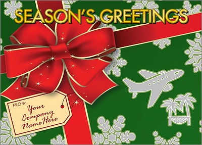 An airplane, palm trees, snowflakes, and a red bow make the Travel Gift Wrap Christmas card perfect for travel agents looking to build strong relationships and increase profits in the new year. Measuring 5" x 7", the Travel Gift Wrap Christmas card is printed on smooth, glossy card stock and includes many upgrades that allow you to completely customize your cards to suit your business. Print a unique message on the inside, add your company name to the front, and choose from a variety of solid and foil-lined envelopes that we can print with your return address. Upload your logo to start customizing your cards now!