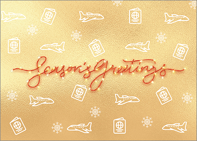 With a gold background and red accents, our Travel Gold Card features a festive look with airplanes, passports, snowflakes, and a season's greetings message scripted in white holiday lights. All Ziti Cards are printed on 5" x 7" glossy card stock and come with a variety of free upgrades and customization options. You can personalize your cards by adding a unique message on the inside, including your company name and logo, and choosing from a variety of color and font options. To make bulk mailings easier and less time consuming, we can also print your envelopes with your return address. Free samples and early order discounts are available!