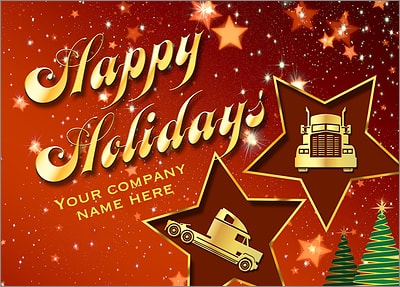 Say happy holidays to clients and customers all across the country with our Trucking Christmas Sky card for trucking companies. Measuring 5" x 7", the Trucking Christmas Sky card is printed on smooth, glossy card stock and features a red, green, and gold design with a happy holidays message across the front. Detailed with twinkling stars and big rigs, this card includes many upgrades that allow you to completely customize the look, tone, and message of your card. Add your company name to the front, include a personal message on the inside, and choose from a variety of solid or foil-lined envelopes that we can print with your return address.
