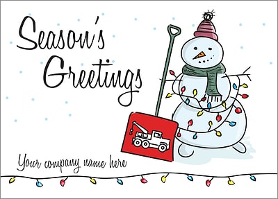 Connect with clients and customers all over the country with our Trucking Shovel Card. Measuring 5" x 7", the Trucking Shovel Card is printed on smooth, glossy card stock and includes many upgrades that allow you to customize your cards inside and out. The front features a snowman with a snow shovel, a truck, holiday lights, and a seasons greetings message, while the blank interior can be printed with your choice of various colors and fonts. Add a message to the inside and choose from a variety of solid or foil-lined envelopes that can be printed with your return address.