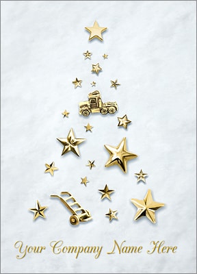 Gold trucks and gold stars in the shape of a tree add fun, festive spirit to the Trucking Star Tree Christmas Card. Measuring 5" x 7", the Trucking Star Tree Christmas Card is perfect for truckers and trucking companies who want to thank their clients and customers for their business throughout the year. It includes many free upgrades and can be completely customized with your colors and fonts, your company name, and free envelopes printed with your return address. Choose from solid or foil-lined envelopes, include a unique greeting on the inside, and add your company logo to create a one-of-a-kind look.